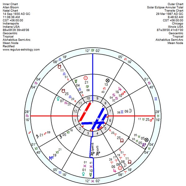 Published in February 1987, The Closing of the American Mind propelled Allan Bloom to sudden celebrity and placed him at the center of a national dispute over the direction of liberal education in American universities. Bloom’s rapid ascent to the national stage is a striking example of how eclipses can elevate a native’s professional aims into the broader cultural arena. Here are the eclipse–natal links.