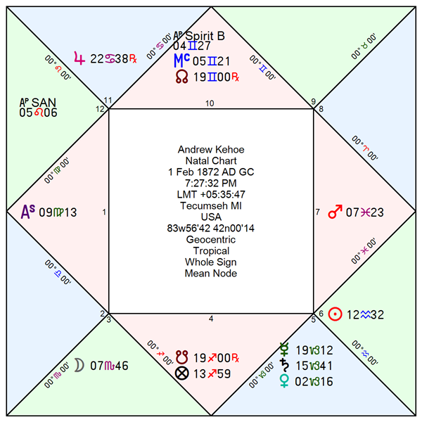 · While we only have a single photo with limited resolution, the shape of Kehoe’s face does appear ovate, consistent with Capricorn which is the sign placement of all earthly triplicity rulers with Mercury/Virgo ruling the rising sign and rising decan.