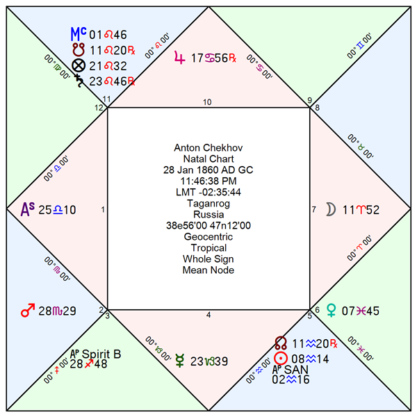 In Chekhov’s nocturnal chart, Jupiter and Saturn fall out of sect, weakening the stability of benefic authority and intensifying the harshness of paternal constraint. Jupiter in Cancer, though exalted by sign, is further marginalized by being out of sect and retrograde, reinforcing the theme that figures who ought to protect, patronize, or embody moral dignity instead appear diminished, compromised, or already in decline. This accords closely with Chekhov’s lifelong preoccupation with fallen authorities—doctors who become indifferent, administrators who preside over cruelty, landowners whose social status masks ethical exhaustion. Saturn, also out of sect, sharpens the severity of Saturn-signified paternal dynamics, intensifying experiences of discipline, repression, and emotional coldness in the early household and reinforcing Chekhov’s sensitivity to quiet tyranny and moral rigidity in positions of domestic or institutional power. By contrast, Venus in Pisces and Mars in Scorpio are both in sect, giving greater efficacy to the instincts of desire, intimacy, and embodied striving. Venus in Pisces—exalted and operating from her own bound—elevates Chekhov’s Venusian themes into the cultural mainstream: tenderness, erotic longing, compassion, and aesthetic sensitivity are not marginal in his work but central to how his characters experience suffering and connection. This helps explain why romantic and emotional longing in Chekhov’s stories resonated broadly rather than remaining confined to subcultural or decadent registers. Mars in Scorpio in sect, placed at the threshold of the 2nd house, gives disciplined, sustained drive in material and survival matters rather than reckless aggression; it points less to violence than to endurance, labor under pressure, and the capacity to extract livelihood from demanding conditions. Biographically, this fits Chekhov’s relentless work ethic—his ability to produce large volumes of writing while practicing medicine, supporting his family, and engaging in public service—suggesting that his financial security and professional standing were built not through patronage or status (the fallen Jupiter theme), but through sustained personal effort, bodily exertion, and practical skill.