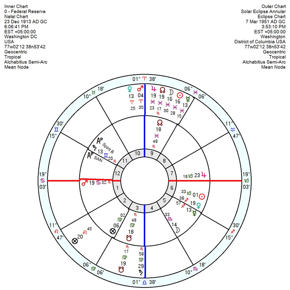 Eclipses. The Treasury-Fed Accord was sandwiched between a 21-Feb-1951 South Node Lunar Eclipse 2VI35 and a 7-Mar-1951 North Node Solar Eclipse 16PI30. In my opinion, the Accord is best read through the 7-Mar-1951 Solar Eclipse. But we need two more delineations to fill out this story. In addition to assigning Mars to the Fed and Jupiter to the Treasury, Mercury 13SA57 in the 6th ruling the 12th signifies inflation as a secret enemy causing the Fed and its employees’ injury. Mercury is also the bound ruler of the North Node 18PI49 with Jupiter 23CP19 the sign ruler of the North Node. With Mercury the source of inflation and Jupiter the source of distorted debt markets, both rulers amplify the North Node’s penchant for higher liquidity and inflation. Placement of the North Node in the 9th house signifies the role of the foreign lands, the courts, and the judiciary where the North Node effects occur.