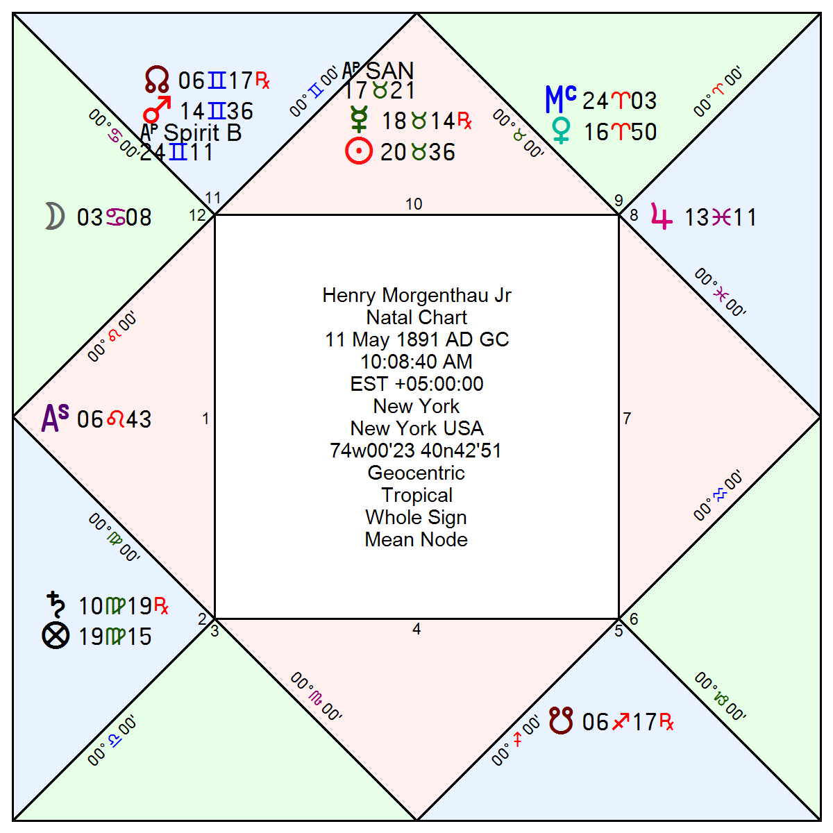 This stands in contrast to Henry Morgenthau Jr., whose preference for balanced budgets reflects a Saturnian emphasis on control and restraint, reinforced by the Lot of Spirit in the bound of Saturn in Gemini. Yet both men share Jupiter as victor, and it is this shared signature that ultimately allows their approaches to converge under different conditions.
