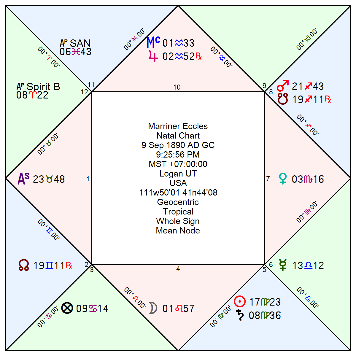 Eccles’s framework is mirrored in his natal chart. With the North Node in Gemini in the 2nd house of wealth, his orientation is toward circulation, exchange, and activity—the very dynamics targeted by fiscal stimulus. His Jupiter in Aquarius retrograde, functioning as Jupiter in Leo, reflects a system in which leadership initiates and private actors respond, generating expansion through the multiplier effect.