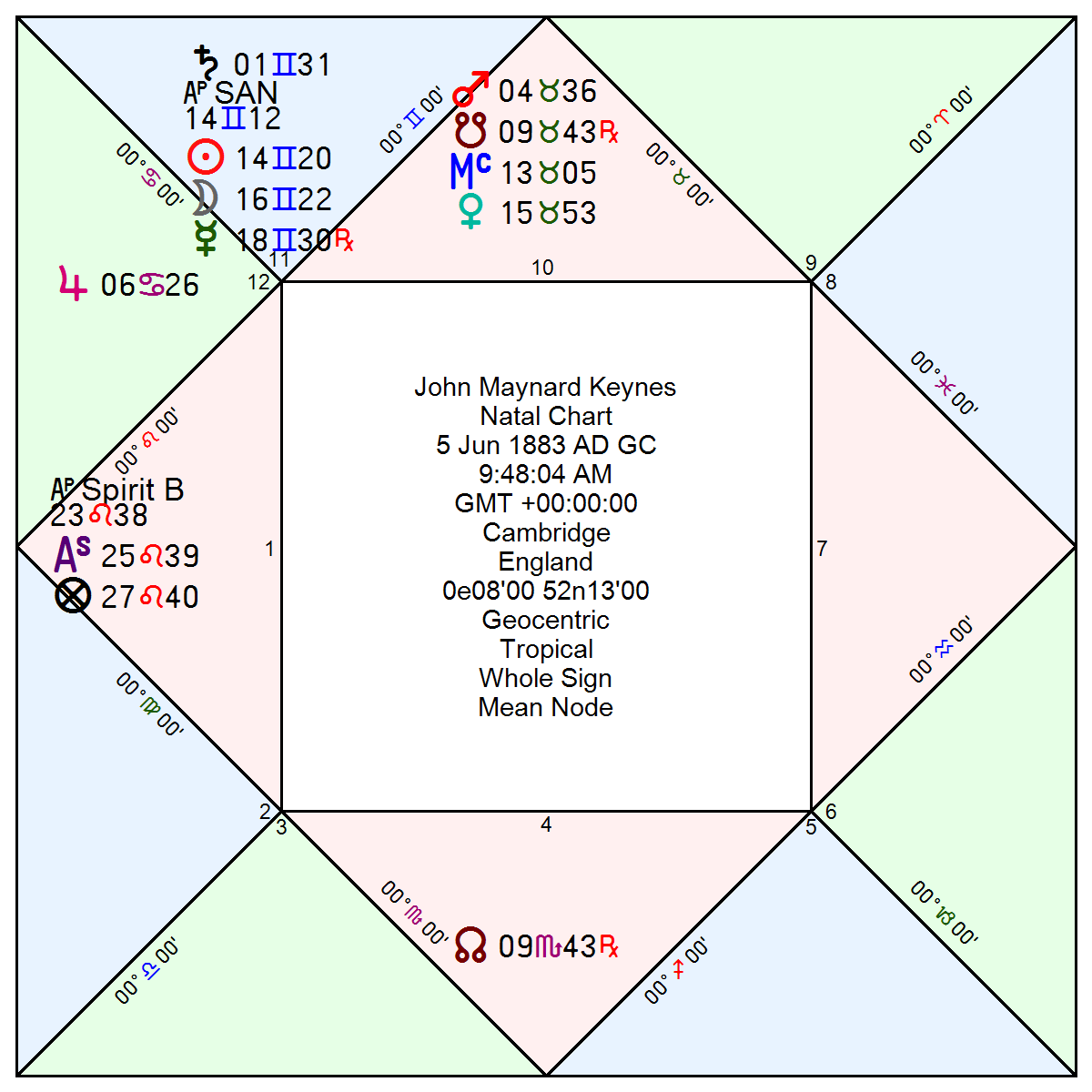 This signature finds a powerful parallel in John Maynard Keynes, whose chart is saturated with Gemini through the Moon, Sun, and Mercury. In Keynes, this emphasis on Gemini extends beyond the mechanics of exchange into a full economic philosophy centered on transaction, velocity, and the restoration of activity. But equally important is Saturn in early Gemini, which in his Moon’s configuration signifies contraction preceding expansion. The sequence is critical: downturn first, then restoration of flow. Keynes’s horoscope thus encapsulates the transition from balanced-budget orthodoxy to fiscal stimulus in its purest form.