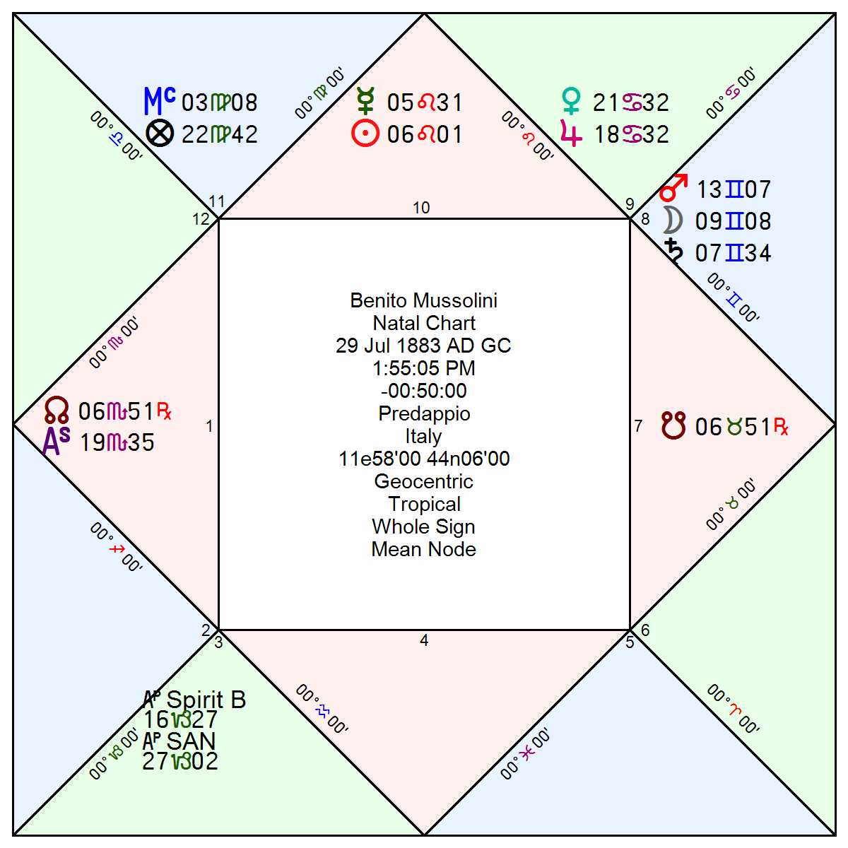 In Benito Mussolini’s nativity, the Moon lies between Saturn and Mars in Gemini, forming a separating conjunction with Saturn and applying to a conjunction with Mars. There is no void-of-course or out-of-sign consideration; both aspects are tight and operative within the same sign. The Moon’s besiegment condition gives Mussolini’s emotional and political life a pendulum-like rhythm: restraint or control (Saturn) inevitably gives way to violence and aggressive assertion (Mars). The condition is made more volatile by the fact that Mars is the out-of-sect malefic, being in a diurnal chart, which intensifies its destructive potential. Saturn, however, is slightly softened due to its placement in the bound of Jupiter and in the 9th house of the law, which opens a window for restraint, negotiation, or clemency to emerge — albeit often temporarily or ineffectively.