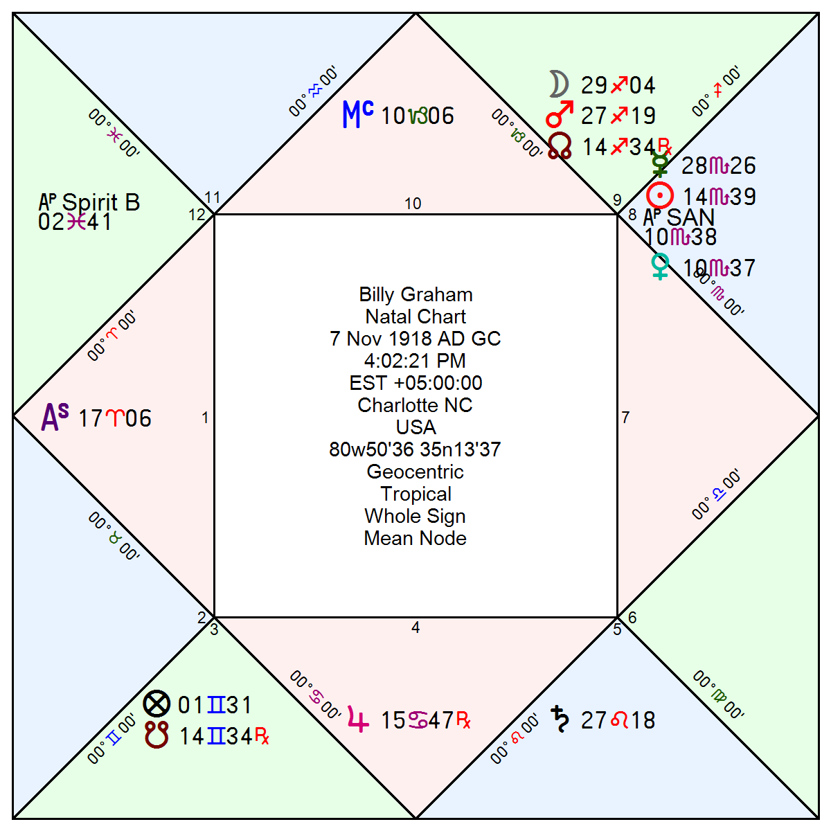 From that cause flows the effect: Mars in Sagittarius in the 9th house as victor. If Jupiter describes the condition of the world, Mars describes the response—a forceful, itinerant proclamation aimed at correcting it. Ruled by that same compromised Jupiter, Graham’s Mars does not merely preach; it confronts. His sermons carried a tone of urgency and decision, often rising to a dramatic intensity that is difficult to capture on the page but unmistakable in delivery—salvation presented not as a distant ideal but as an immediate necessity. The Sagittarius–9th house emphasis sends this message outward across borders, reflected in his global crusades and lifelong travel, while Mars supplies the fire, rhythm, and rhetorical pressure that compelled audiences to act. This dynamic—Jupiter as moral failure, Mars as corrective proclamation—defines the architecture of his life’s work.