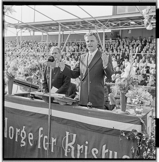 Following graduation, Graham entered ministry at a moment when evangelical Protestantism was reorganizing itself for the modern age. His early rise came through the interdenominational organization Youth for Christ, where he worked alongside the intellectually inclined evangelist Charles Templeton. Templeton’s embrace of higher criticism and his challenge that Graham reconsider the literal authority of Scripture forced a defining decision. In 1949, Graham resolved this internal conflict by affirming the Bible as the literal word of God, a choice he later credited with giving his preaching both clarity and authority. By abandoning intellectual doubt in favor of declarative certainty—summarized in phrases such as “The Bible says”—Graham found a rhetorical style that resonated powerfully with mass audiences.