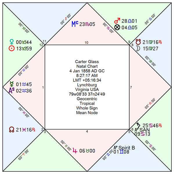 The horoscope is diurnal, placing Saturn and Jupiter in sect, a configuration that helps explain how Carter Glass was able to translate financial theory into durable political action. Saturn in Cancer retrograde, as the in-sect malefic and victor of the chart, describes his persistent attempt to negate centralized financial authority by constructing decentralized institutional structures. Because Saturn is in sect, its restrictive impulse operates with a degree of legitimacy and social resonance rather than destructive excess; Glass’s critique of centralized banking power therefore found support across a broad political constituency, providing him with the cover needed to challenge powerful financial interests. The in-sect benefic Jupiter in Taurus in the fourth house complements this picture by tying financial policy to the economic interests of land and agriculture. Glass consistently framed banking reform in terms favorable to farmers and regional economic stability, themes entirely consistent with Jupiter’s fertile, land-based symbolism in Taurus. By contrast, the out-of-sect planets Venus and Mars describe areas of tension or weakness in the chart. Venus in Capricorn out of sect reflects Glass’s reactionary racial views, particularly his support for suffrage restrictions at the Virginia Constitutional Convention of 1901; Capricorn’s association with established wealth and hierarchy aligns with his preference for limiting political participation to literate property owners, a stance that remained largely confined to the Bourbon Democratic political culture of the South. Mars in Libra out of sect, already weakened by being in the sign of its detriment, suggests the ineffective regulatory environment that Glass often criticized. The symbolism fits a system in which regulators were both structurally weak and politically marginal: not only did oversight fail to restrain speculative finance, but the officials responsible for regulation rarely occupied the central corridors of power where decisive authority was exercised.