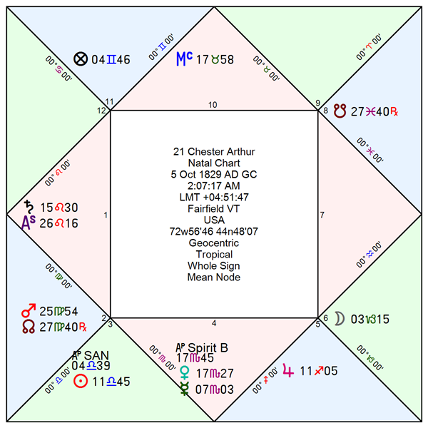 Arthur’s horoscope makes this institutional formation legible. With Leo rising and the Moon in the 6th house, his life is organized around clerks, subordinates, and the management of daily operations rather than charismatic command. The Moon’s separation from Mars in Virgo describes an early formation in disciplined service and logistics; its later application to Mercury in Scorpio shows those same techniques repurposed into coercive accounting and revenue extraction at the New York Custom House—the “pound of flesh” exacted by clerks on goods passing through the port. The Moon’s change of sign from Sagittarius to Capricorn marks the pivot from mobile service to durable office: campaign work gives way to hierarchy, routine, and institutional permanence. Arthur does not invent the machine; he becomes fluent in how to run it.