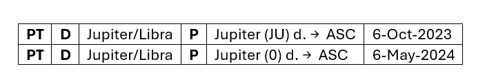 I first published this delineation of Jupiter in the 4th edition of A Rectification Manual, dated March 23, 2023 (pp. 22–23), in advance of the following primary direction sequence: