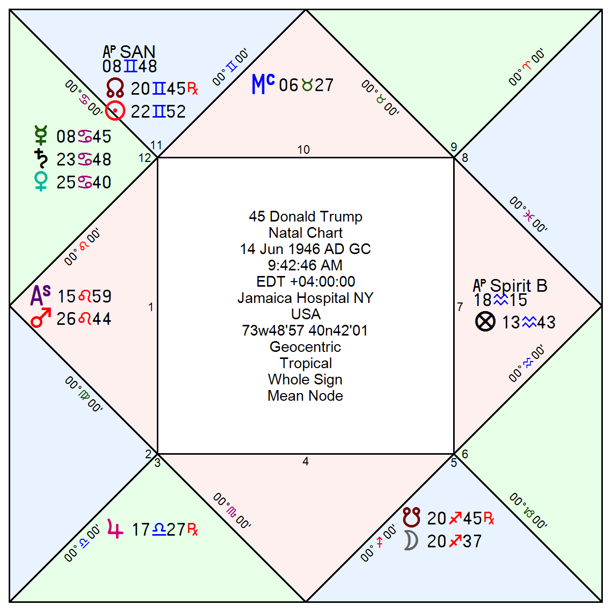 By contrast, Firdaria has demonstrated a better match to Trump’s political fortunes. According to delineation, the North Node in the 11th house of friends, groups, and political alliances bonifies the house by predicting an increase in those affairs. The North Node is co-present with the Ascendant ruler, the Sun, which forges a connection between Trump and political alliances. Moreover, Trump’s birth date follows a solar eclipse, whose conjunctional degree of 8° Gemini 48′ also falls in the 11th house.