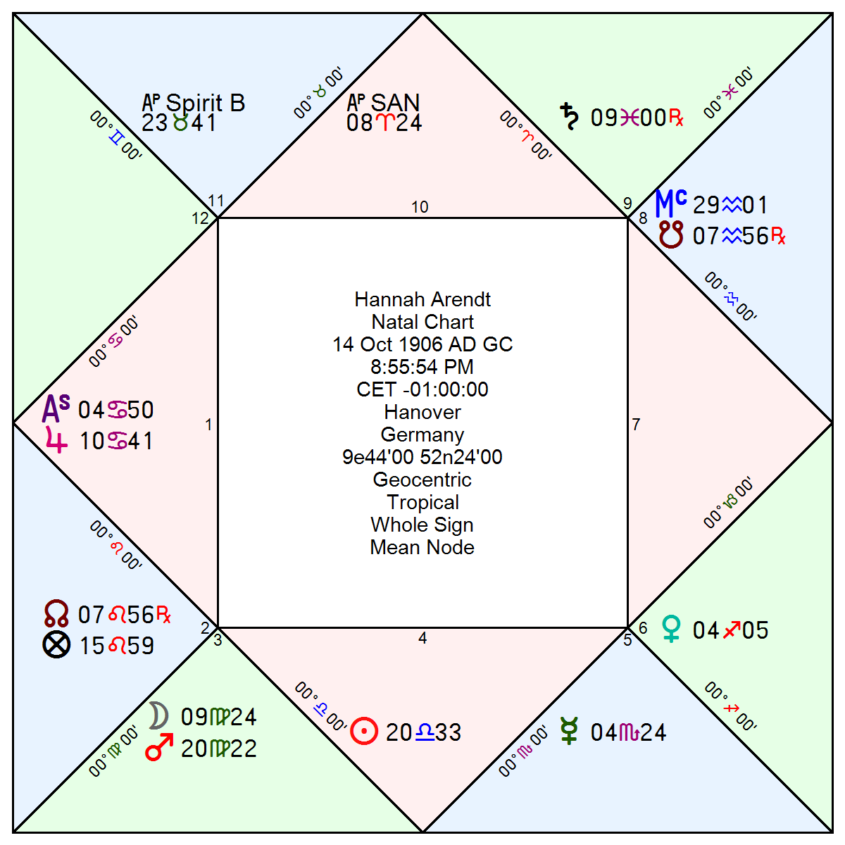 Movement from Saturn, the greater malefic, to Jupiter, the greater benefic, is given favorable treatment by Maternus and is consistent with Arendt’s transition away from the statelessness imposed on her by totalitarian regimes toward a teaching career in political theory and moral philosophy. The figure is nocturnal, which means both superior planets are out of sect; this makes Saturn harsher and Jupiter less benefic. For Maternus, the waning Moon is less favorable than a waxing Moon. Instead of the "rich, famous, and powerful" delineation for a waxing Moon separating from Saturn and applying to Jupiter, the waning Moon yields administrators, managers, and the like—all with a lower level of authority. Arendt was a prominent intellectual within her field, but she did not operate on the highest level attained by society’s power brokers.