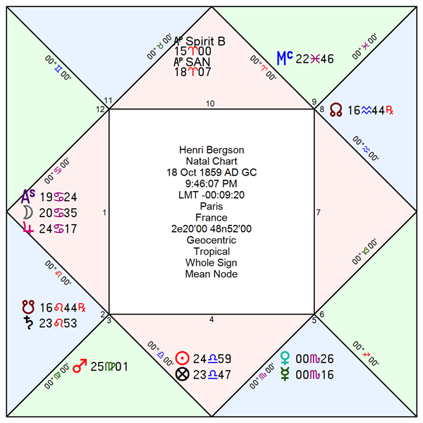 Because Bergson was born after sunset, his nativity is nocturnal, making the Moon the in-sect luminary and the proper governor of the chart. Her prominence in the 1st House confirms that intuitive perception and bodily sensitivity were his primary modes of knowing. Yet the planet she immediately applies to — Jupiter — is the out-of-sect benefic. Though well-placed in Cancer, Jupiter’s foreign sect limits how far its philosophical optimism could penetrate the rational establishment; Bergson’s gospel of intuition was admired yet never fully absorbed by the academy. Mars in Virgo, by contrast, is the in-sect malefic: sharp, technical, and argumentative, representing the empirical and analytical thinkers who proved the more forceful voice within his lifetime. Their dominance in public debate reflected the chart’s sectual balance — the nocturnal Moon’s insight confronted by the daylight rigor of Mars-ruled reason.