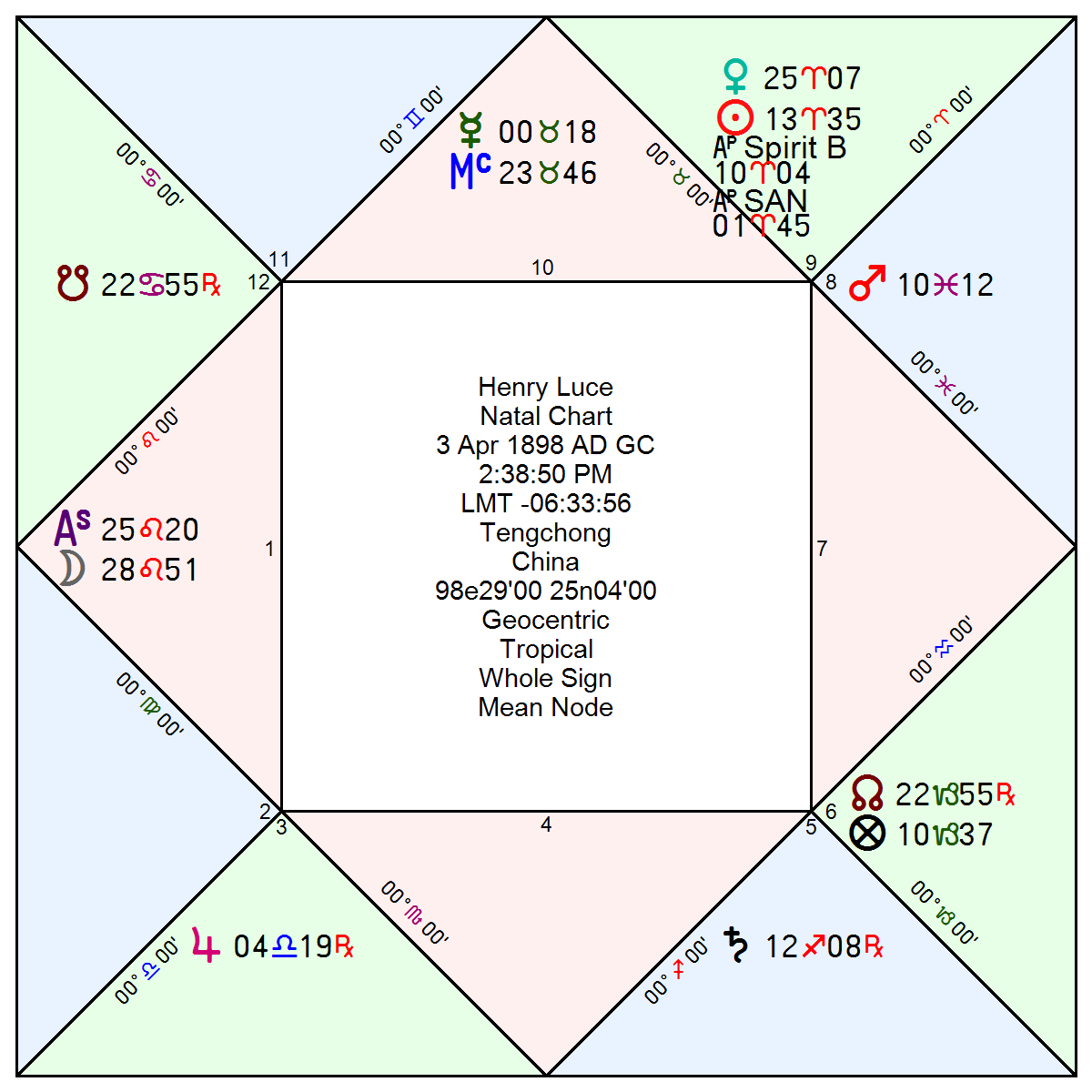 Horoscope is conjunctional; Luce was born after a New Moon. This is consistent with the ‘early-bloomer’ thesis. Luce created TIME magazine at the young age of 24 and never looked back.