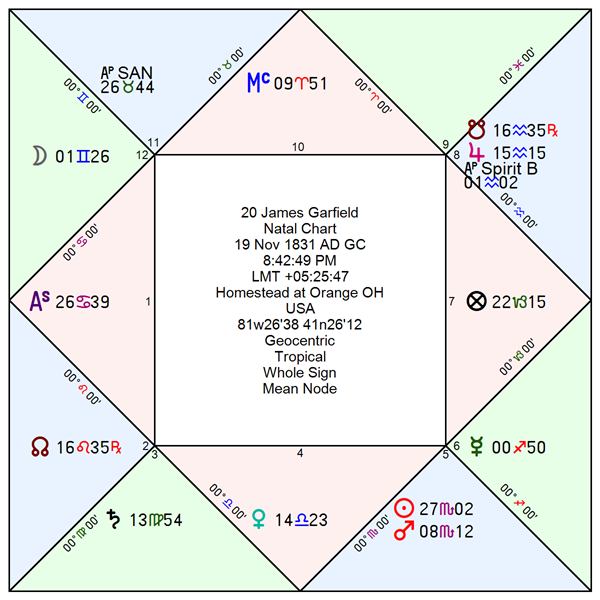 Rectification Note: Within the Presidential database, my proposed rectification for Garfield differs substantially from the A-rated birth time of 2:00 AM based on Charles Latimer, a close friend of the family given the data by Garfield’s mother and published in 1942. Using Stage I rectification techniques I argue that Mercury must be in Sagittarius (not Scorpio) because Garfield fell into the water over fourteen times during a summer job walking horses on a towpath pulling barge traffic. Likewise the Moon must be in Gemini (not Taurus) because of Garfield’s penchant for reading and collecting books which littered every room of his house. Garfield was also born into poverty and was never a materialist (were the Taurus Moon to be accurate). These two simple observations limit the birth time to between 6:27 PM and 12:00 Midnight for his birthday. Garfield must be born during evening nocturnal hours. Please refer to my book A Rectification Manual: The American Presidency. 4th edition, pps 438-555 for a summary of these observations, directions, and other methods used to fine tune the Ascendant degree.