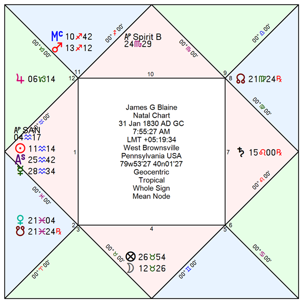 Delineation. The Moon separating from the Sun in Aquarius situates Blaine’s public persona at a point of emergence from obscurity into visibility, with the luminary in the bound of Venus lending a conciliatory, beneficent tone to authority. This is not a hostile Sun; rather, it is a Sun disposed to cooperation, public works, and the extension of collective benefit through institutions. The Sun’s placement in Aquarius emphasizes organized social projects, national coordination, and the improvement of civic infrastructure, while its bound by Venus and the presence of Venus in Pisces (despite her diminution by the South Node) incline authority toward ideals of generosity, amelioration, and the public good. The Moon in Taurus in the place of her joy, in Mercury’s bound and in close configurational sympathy with Mercury rising near the Ascendant and his own place of joy, frames the emotional and rhetorical engine of the nativity: the native becomes legible to the public as a persuasive voice who can translate abstract civic ideals into accessible speech. This is a configuration that recognizes the legitimacy of large-scale public works, national development, and institutional action as vehicles for distributing material benefit across the populace, and it explains Blaine’s instinctive alignment with projects of national expansion, railroads, and commercial integration as civic goods, not merely private gain.
