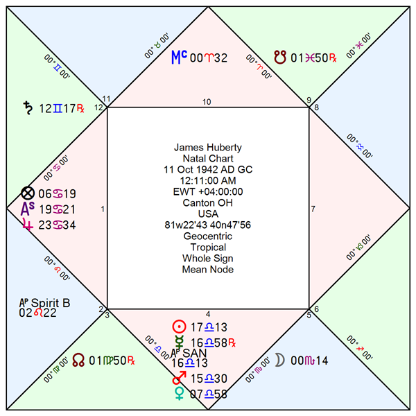 This week we return to another Jupiter-in-Cancer themed horoscope, which demonstrates the power of its Cancer-ruled Moon to substantially modify the promise of the greater benefic in the sign of his exaltation. Huberty’s horoscope features Jupiter in Cancer in the rising sign, a configuration shared with Hannah Arendt. In Huberty’s chart, the Moon is in Scorpio and, aside from its separation from Jupiter, is either void-of-course or completely feral if one sets aside that separation. There is also the unusual configuration of Mercury conjoining Mars immediately after birth, which operates here as a spree shooter signature.