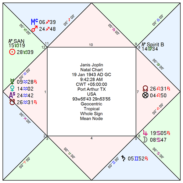 The horoscope of Janis Joplin is anchored by Venus in Aquarius as victor of the horoscope, a placement that immediately situates her within a collective, anti-traditional, and future-oriented aesthetic. Venus in Aquarius does not seek refinement or polish; it seeks truth, difference, and emotional honesty unmediated by convention. Placed in the bound of Jupiter, this Venus absorbs Jupiter’s amplifying, generous, and morally charged qualities, giving Joplin’s music its unmistakable quality of emotional excess offered as a gift. Her performances were not crafted objects so much as acts of communal release—Venusian pleasure fused with Jovian largesse. This configuration aligns uncannily with her rise during what her contemporaries explicitly named the “Age of Aquarius”: a cultural moment defined by collectivism, emotional openness, and the rejection of inherited social forms. Venus in Aquarius made her a voice of the group rather than above it, while Jupiter’s involvement ensured that her art carried the weight of meaning, belief, and emotional magnitude rather than mere entertainment.