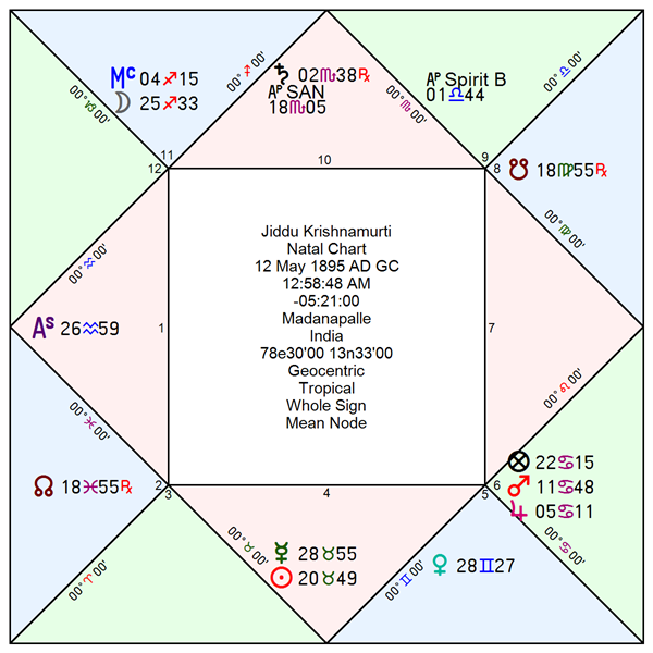 Krishnamurti’s nocturnal chart makes Venus the in-sect benefic and Jupiter the out-of-sect benefic, shaping the entire Moon’s Configuration. As a result, Jupiter’s sponsorship—embodied by Annie Besant and the Theosophical hierarchy—developed outside the cultural mainstream and ultimately could not endure. Meanwhile, Venus, strengthened by sect and receiving the Moon’s only application, became the successful vehicle for his message: gentle speech, dialogue, and widely accessible teachings. Sect explains why the movement (Jupiter) failed, while the message (Venus) survived and spread globally. Krishnamurti’s words outlived the organization that launched him, because Venus had the mandate of sect while Jupiter did not.