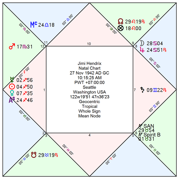 Biographical Match. This is a delineation match to Hendrix’s childhood: exposure to domestic violence, alcoholism, instability, and emotional unpredictability. The Moon–Mars trine becomes the internal rule: attachment is dangerous, love can wound, security is always conditional. As an adult, this Mars signature re-emerges in band conflicts, manager disputes, and intense, combustible relationships. He repeatedly reenacts childhood dynamics: seeking family (11th) but finding sabotage (12th). Mars in Scorpio also resonates with the raw, erotic, and physically extreme style of his guitar performance — emotion fused with danger.