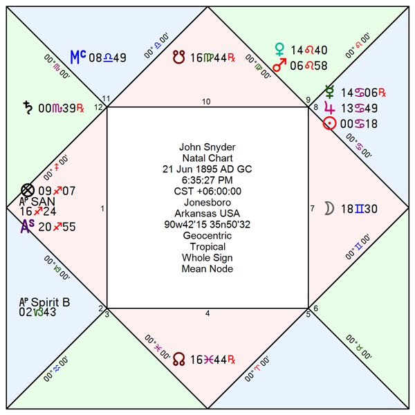The Moon’s ingress into Gemini in the 7th establishes a life oriented toward alliances, partnerships, and adaptive social intelligence, where advancement depends not on solitary initiative but on the ability to form and maintain relationships. Gemini emphasizes mobility, exchange, and practical engagement with others, while the 7th house directs this toward key personal and professional associations that shape the trajectory of the life. In Snyder’s case, this is reflected in his early adult years, where his development occurs through workplace integration, community standing, and social positioning, rather than through elite education or independent distinction. His entry into banking in 1920 as a bookkeeper in Forrest City, Arkansas, exemplifies this phase: a role grounded in interaction, transactional knowledge, and responsiveness to others, setting the stage for later advancement through connections rather than credentials.