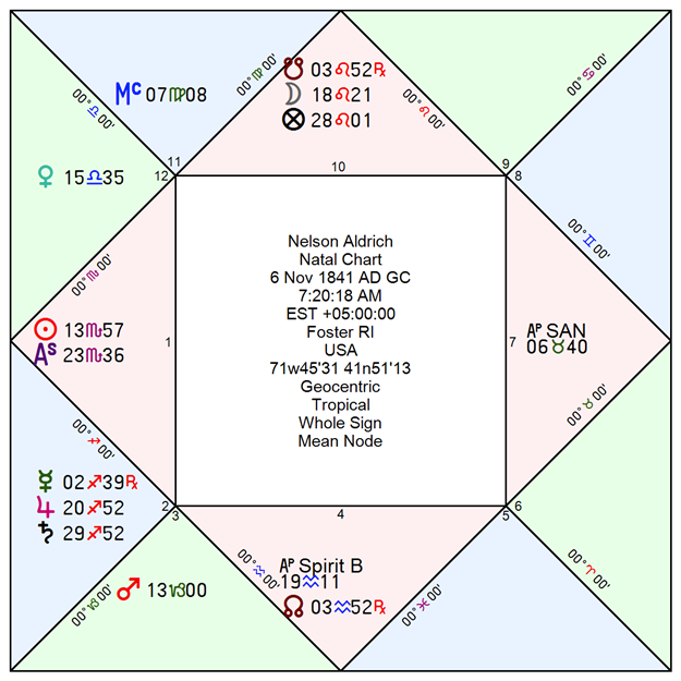 The two out-of-sect planets operate differently. Mars in Capricorn reflects the era’s episodic efforts to restrain corporate power through trust-busting, associated most prominently with Theodore Roosevelt and, to a lesser extent, the emerging intentions of William McKinley before his assassination. Although this Mars symbolism directly challenged Aldrich’s political program, its out-of-sect condition limited its influence during most of his Senate career, consistent with the idea that out-of-sect planets often describe forces temporarily out of political power. Only near the end of Aldrich’s career, as Progressive reformers gained momentum, did this Martian influence begin to expand—but by then the bulk of his legislative work had already been accomplished. As for Venus, the out-of-sect benefic, I am unable to ascertain its behavior and influence on Aldrich’s career so leave Venus’ sect condition unsolved for the moment.