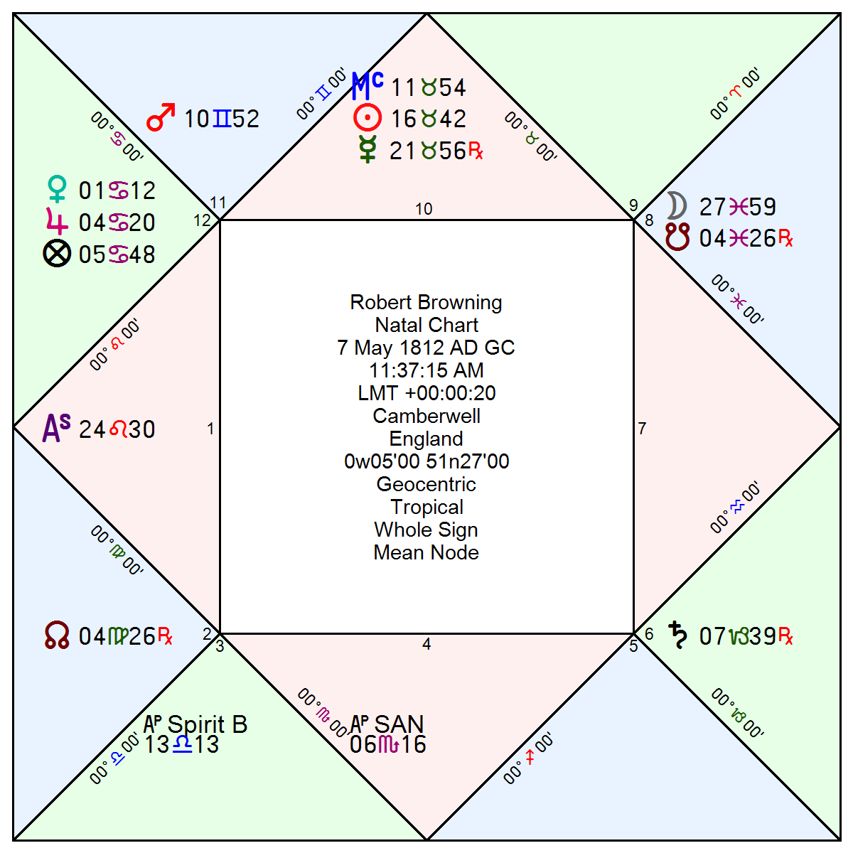 The sect status of Mercury is the least important planetary sect condition to consider because Mercury can be either diurnal or nocturnal depending on its configuration. As this is a research question worthy of merit on its own, I will set aside how to compute Mercury’s sect status for another day and disregard its influence on the Moon’s configuration. As for Venus, she is the out-of-sect benefic in a day chart. This seems to reflect that Venus’ artistic expression from a place of seclusion and retreat (e.g., his wife Elizabeth’s chronic health problems conferring her invalid status) was not a common theme for Victorian poets. However, this does not appear to have limited the eventual high social status attained by Browning in his literary career. He was regarded as a leading UK poet alongside Tennyson and was buried in Poets’ Corner at Westminster Abbey.