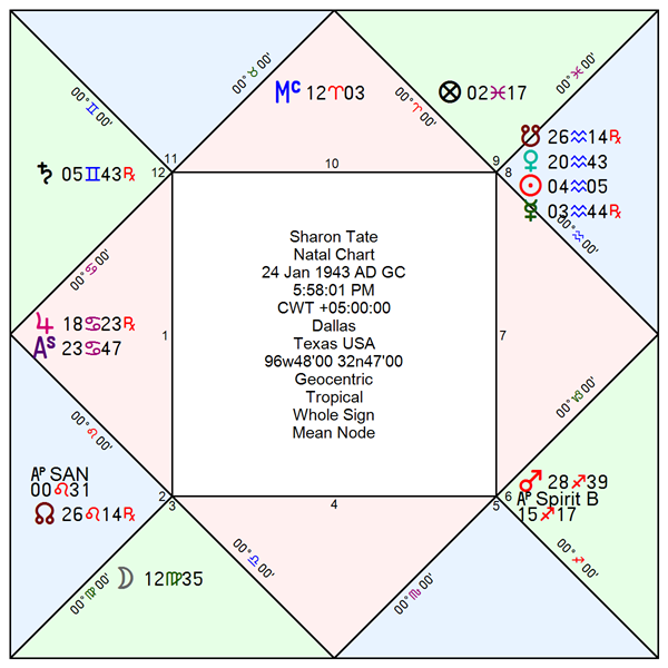 Tate’s chart is diurnal, placing Saturn and Jupiter in sect and leaving Mars out of sect. This distinction materially alters the tone of the entire configuration. Saturn’s in-sect status softens its sting; its already weakened condition—retrograde in Gemini—produces absence rather than oppression. The Moon’s separation from Saturn therefore describes non-containment without cruelty: freedom through lack of restraint rather than hardship imposed. Jupiter, also in sect, renders her ambitious relationships with producers and directors legible within the norms of Hollywood film culture of the 1960s. Advancement through sponsorship, marriage, and projection is not morally aberrant in this context; it is socially sanctioned and culturally intelligible. Mars alone stands outside the solar order. As the out-of-sect malefic, Mars becomes the agent of excess and malice. When the Moon finally applies to him by square, the configuration releases its most violent potential, magnifying the brutality of Tate’s death. The chart thus places harm not at the beginning of life, but at its terminus, where the solitary out-of-sect malefic waits.