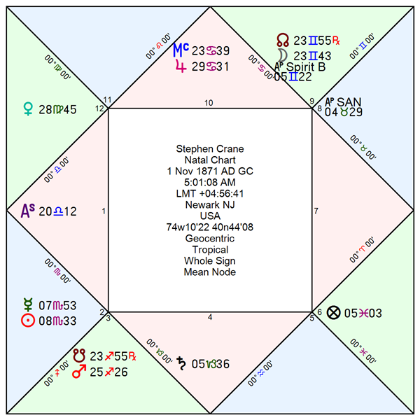 Crane was born after a Full Moon, making his horoscope preventional. According to the early/late bloomer thesis, the bulk of his life’s purpose should unfold in the second half of life. With the midpoint of his short twenty-eight-year span falling in February 1886, all of his published works appeared after this midpoint, confirming the late-bloomer thesis.
