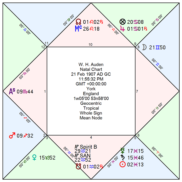 Because Auden’s horoscope is nocturnal, Jupiter and Saturn operate out of sect, which helps explain both the power and the limits of his moral authority as a poet. His great period of cultural influence coincides with moments of crisis and social breakdown, when themes of moral decay, institutional failure, and ethical disorientation resonate widely; yet in the postwar world of economic expansion and democratic confidence, this same moral gravity increasingly feels out of phase with the prevailing mood. As a result, his reach narrows from that of a generational voice to that of a respected but more specialized moral diagnostician, read deeply by intellectual and religious audiences rather than embraced as a broad cultural leader. Saturn’s out-of-sect condition sharpens the austerity of his ethical vision, giving his later work a tone of burden and judgment that resists easy cultural absorption. By contrast, Venus and Mars being in sect helps explain why themes of love, intimacy, and moral conflict remain emotionally compelling in his work, with Mars in Sagittarius finding especially clear expression in the confrontational travel narratives and ideological testing of Journey to a War and the political drama of The Ascent of F.6, while Venus in Pisces shows up in his sustained, compassionate treatment of flawed love and emotional dependency in poems such as “Lullaby” and the later love sequences addressed to Chester Kallman, where tenderness and vulnerability remain among the most accessible and enduring elements of his work.